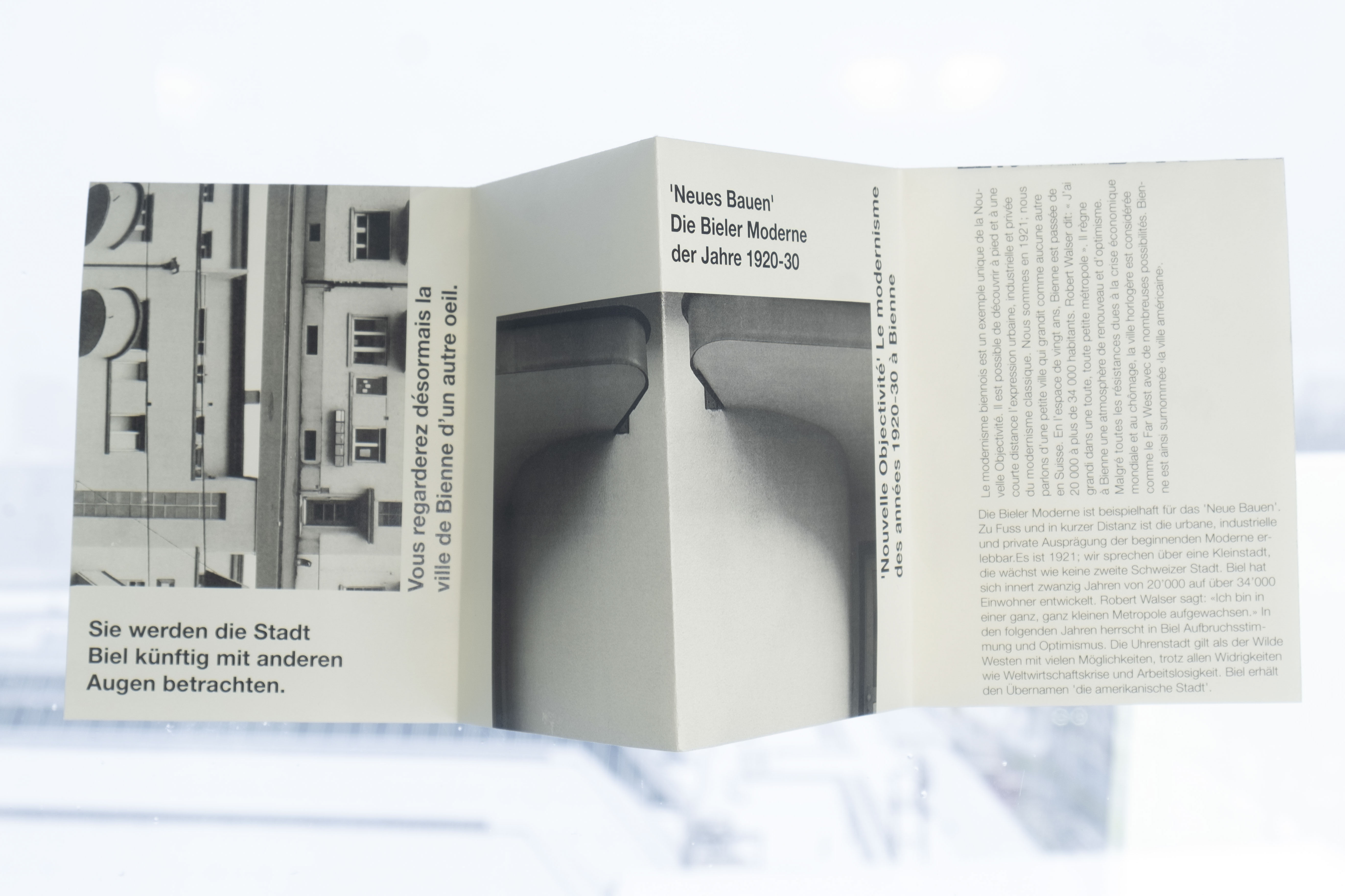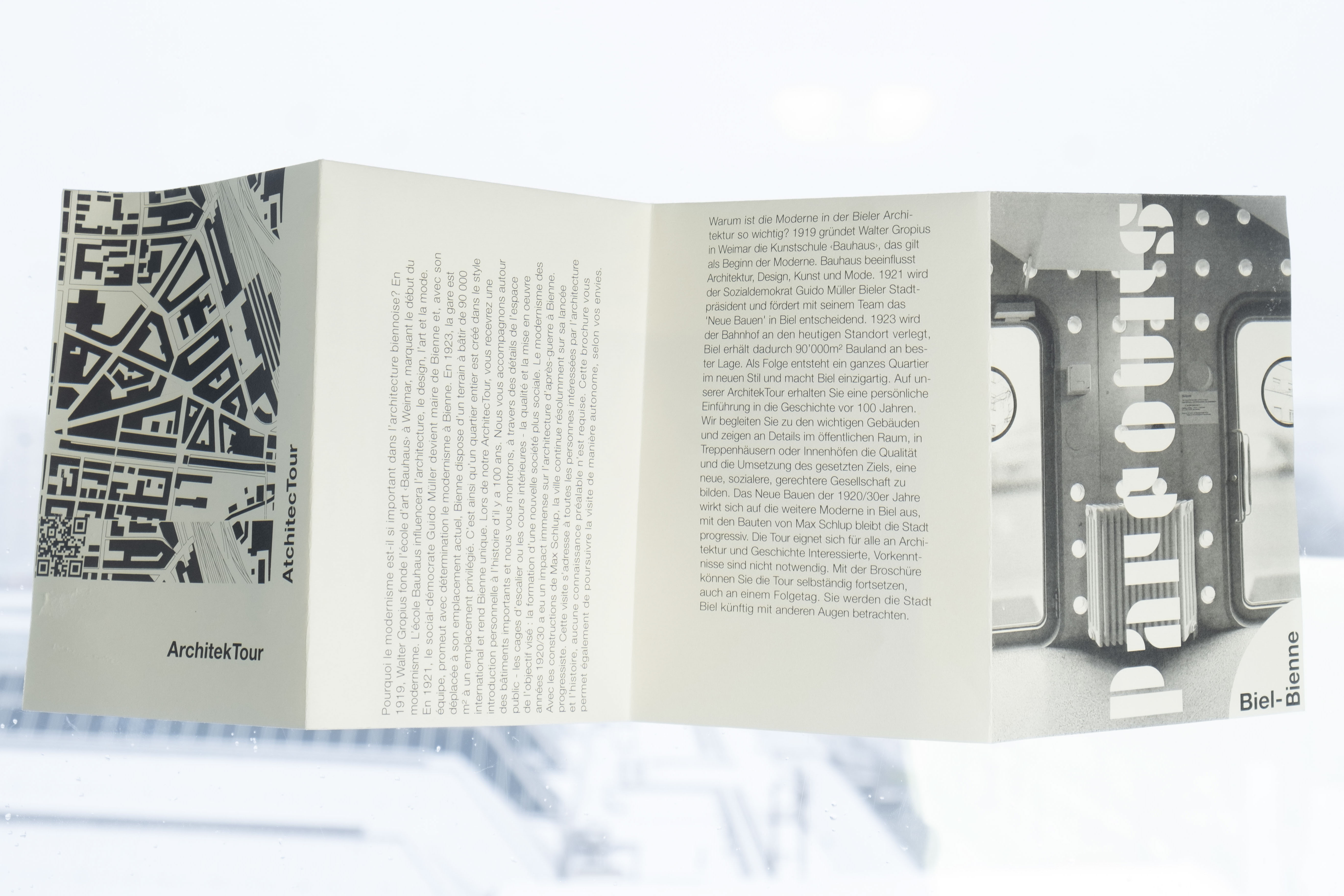 „Parcours Biel‑Bienne“ organisiert tolle Architekturtouren der 20er und 30er Jahren in der Stadt Biel. Um die Vergangenheit und Gegenwart in meinem Design zu verbinden, wählte ich die Bauhausschrift „P22 Albers“. Eine Herausforderung war die Zweisprachigkeit. Ich entschied mich, den deutschen Text immer horizontal und den französischen Text jedes Mal vertikal zu setzen. Durch diese Regel ist mein Layout geprägt vom Prinzip der „Form Follows Funktion“.